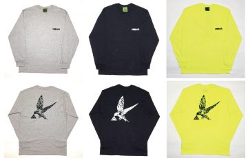 こちらは今年の夏にTshirtsで作りましたデザインのL/S Pocket Tshirtsとなります。幸せを運ぶといわれる渡り鳥のツバメをモチーフにして、そんなツバメが加えてるのはKAONKAのlogo。果たしてこれは幸せなのか?それとも、いや、もう止めておきましょう。ベースとなるTshirtsは6.0ozのcotton L/S Tshirtsを使用していて、カラーはベーシックなGREY/BLACK, BLACK/WHITE, 変わり種のYELLOW/BLACKの3色展開っす。