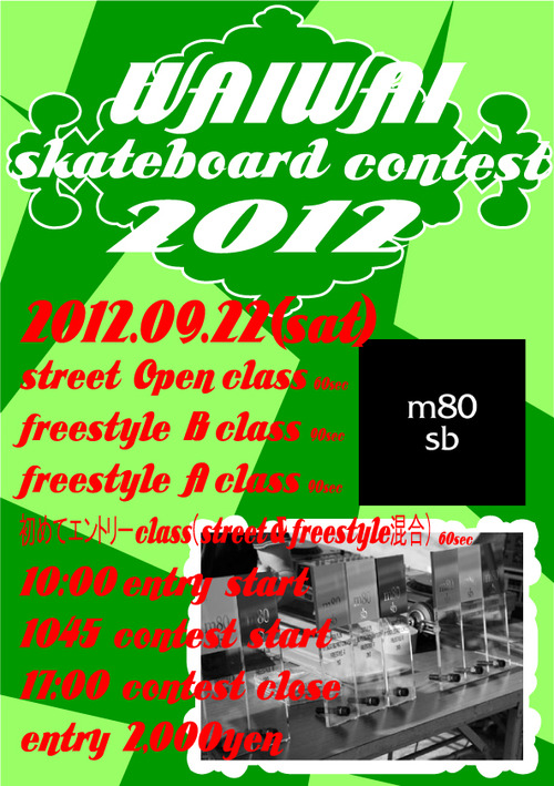 9月22日(土)、静岡県の浜松にて、M80’sk8 shop主催のワイワイコンテスト2012が催されます。