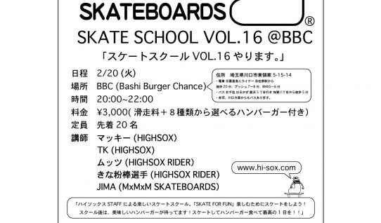 「ハイソックススケートスクールVOL.16やります。」 2/20(火)20時〜22時までの2時間、 ハンバーガーもポテトも美味しすぎる BASHI BURGER CHANCE川口店…