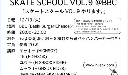 「ハイソックススケートスクールVOL.9やります。」 12/13(火)20時~22時までの2時間、 ハンバーガーもポテトも美味しすぎる BASHI BURGER CHANCE川口店…