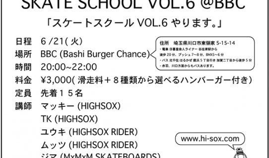「ハイソックススケートスクールVOL.6やります。」 6/21(火)20時~22時までの2時間、 池袋にハンバーガー専門店となる 2号店ができると話題のBASHI BURGER C…