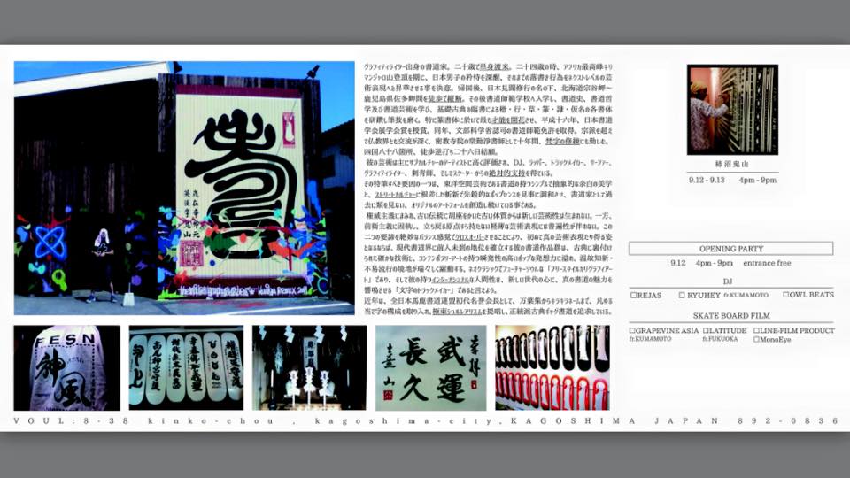その特筆すべき要因の一つは、東洋空間芸術である書道の持つシンプルで抽象的な余白の美学と、ストリートカルチャーに根差した斬新で先鋭的なポップセンスを見事に調和させ、書道家として過去に類を見ない、オリジナルのアートフォームを創造し続けている事である。