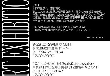 スケーターであり PMAを主催しARETH CREWでもあります JAHI氏の絵の個展が全4カ所で開催です!! JAHI氏はスケートはもちろんですが 人として 自分がかなり影響を受…