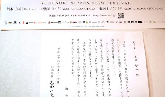 先日、熊本DENKIKANにて開催されました 横乗日本映画祭!! その時の収益から熊本地震の復興のために 10万円を熊本市に届けてきました! これもたくさんの皆様が 会場に足を運ん…