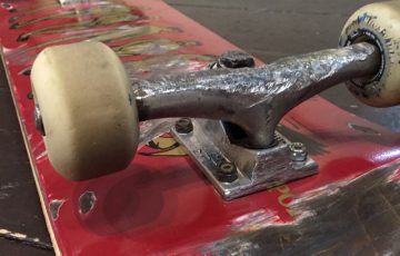 天馬のセッティング。インスタント吉祥寺がオープンしてからスケートボードをはじめた彼は、乗り始めてから毎日滑ってるんじゃないかな。店で昔の古いビデオから最新のDVDまで観てから滑りに行くスタイルは今も変わりません。店に集まる仲間同志で『convenience』としてアップされた映像の企画者でもあり、ビデオも撮影、編集もしてました。そして意外とグルメ好き。いや食感好きか。メガネがアイコン。SLIDER MAGAZINEで特集されたときは泣きました。現在デッキはPASS~PORTサイズ8.125、彼は7.75~8.25くらいまで、気分で乗れちゃうオールラウンダー、ハンガーがゴリゴリのトラックはTHUNDER TRUCKS147HI、ベアリングはSWISS BONES、ウィールサイズ55mm、SPITFIRE F4を使用、後ろ向きのスライドやグラインドを得意とするスケート痕は、デッキを見るとわかります。トラックの痕跡は常日頃ストリートですべっているのがわかります。デッキは新調したばかりですが、天馬のデッキは毎回満遍なく削れます、数日で。全裸な男達の絵柄はこれから天馬に削られていくことでしょう!って今見たら全員削られていました。そしてこのデッキであのスポットでいいフッテージを残せた事は内緒です。