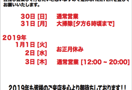 遂に本日2018年のラストデイとなりました、本日も元気にSHELTER OPENしております。既にお休みの方がOPENと同時にご来店、アップが遅くなりましたが本日も最終営業日を気…