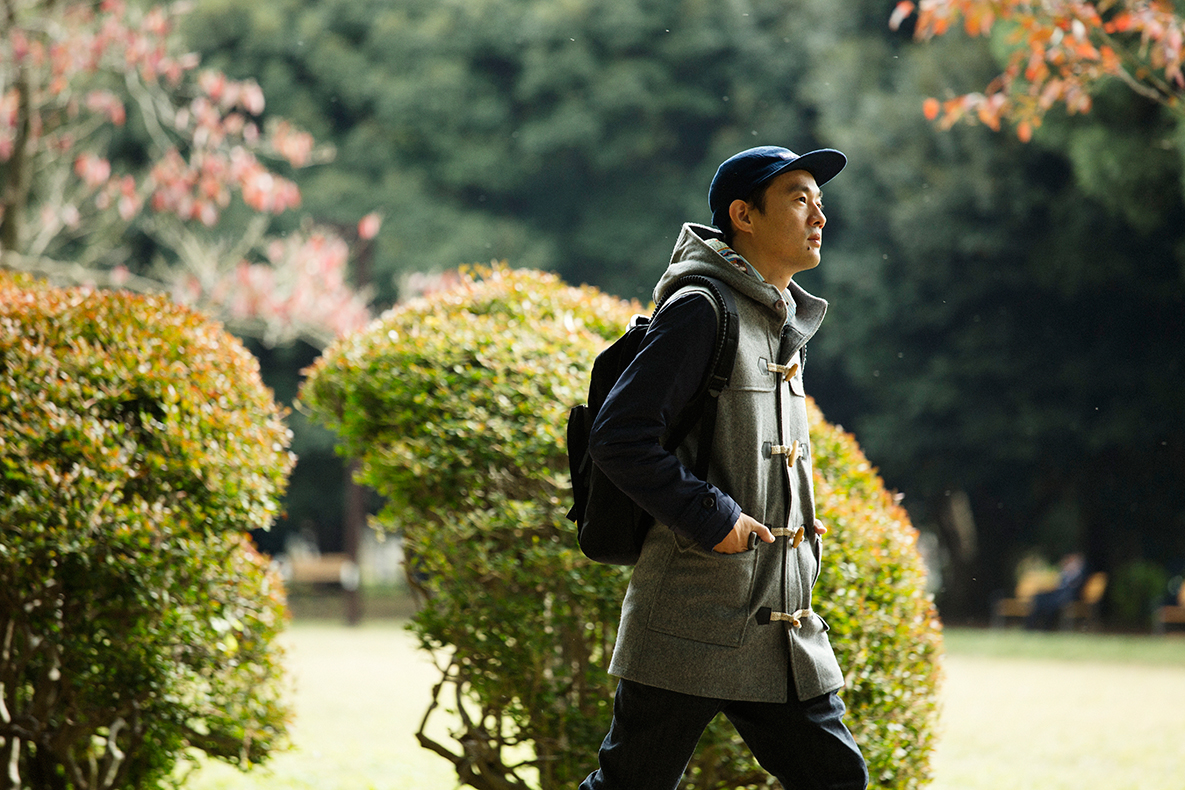 90年代の名作スケートビデオのジャケをコラージュした総柄裏地のダッフルコート