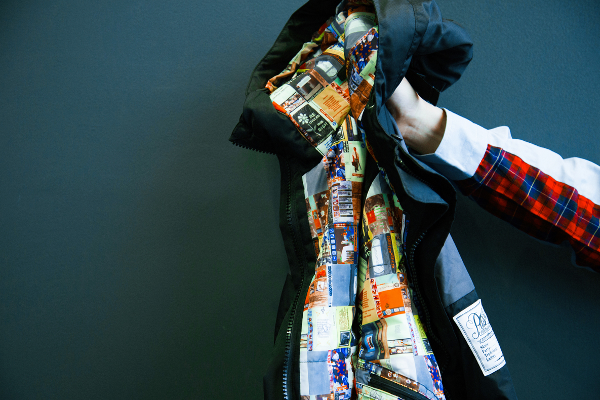 90年代の名作スケートビデオのジャケをコラージュした総柄裏地の中綿入りマウンテン