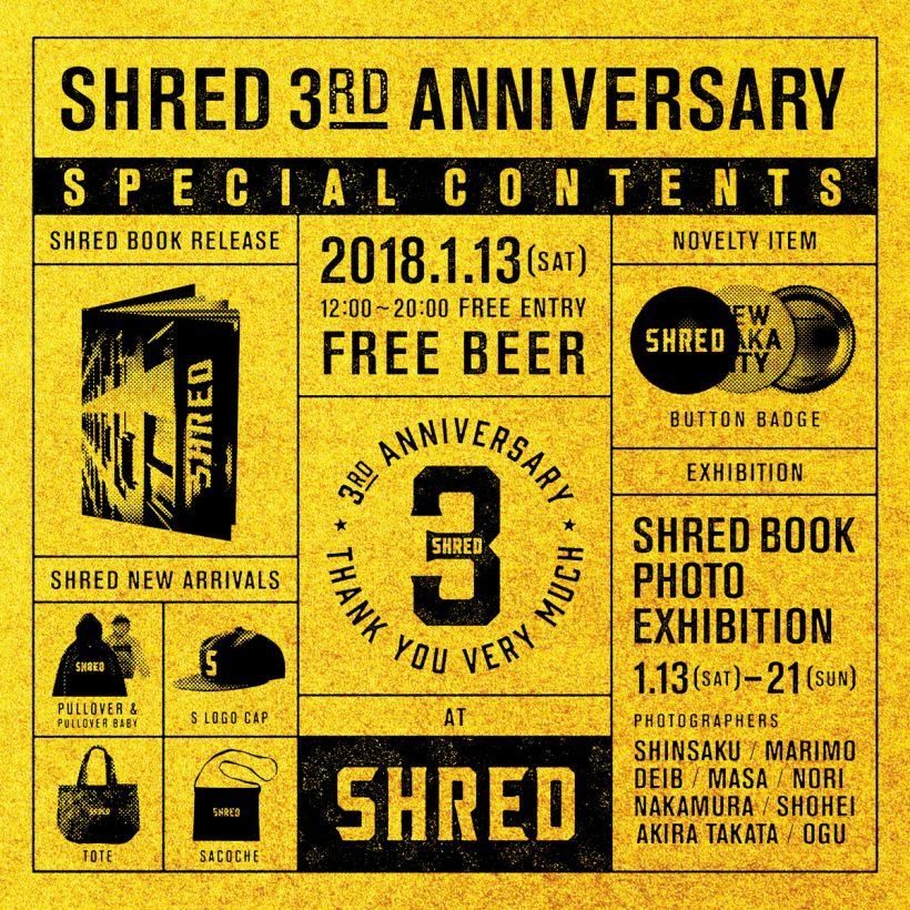 FREE BEERとノベルティー、SHREDアイテムリリースなどみなさまが楽しめる空間を作っております。是非みなさまお誘い合わせの上、遊びにいらしてくださいませ。