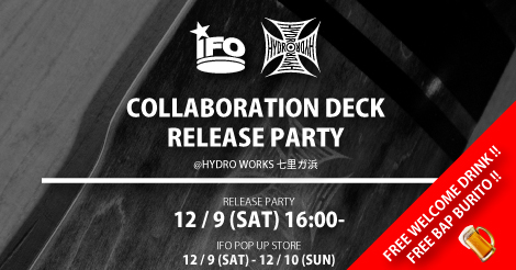IFOとHYDRO SHAPESのコラボレーションデッキの発売に向け、12月9日土曜日16時から、HYDRO WORKS 七里ガ浜にてリリースパーティーを行います。 当日は、コラボ…