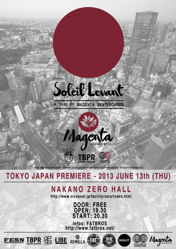 MAGENTA SKATEBOARDSが世界に向け発信するフルレングスビデオ、“SOLEIL LEVANT”(ソレイル・レヴァント)の東京試写会が6月13日に中野ゼロ・ホールにて行われます。
