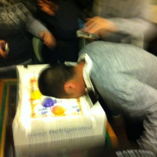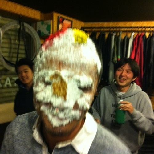 一応ジャケットを脱ぎ、押すなよ!の合図でケーキ入頭。