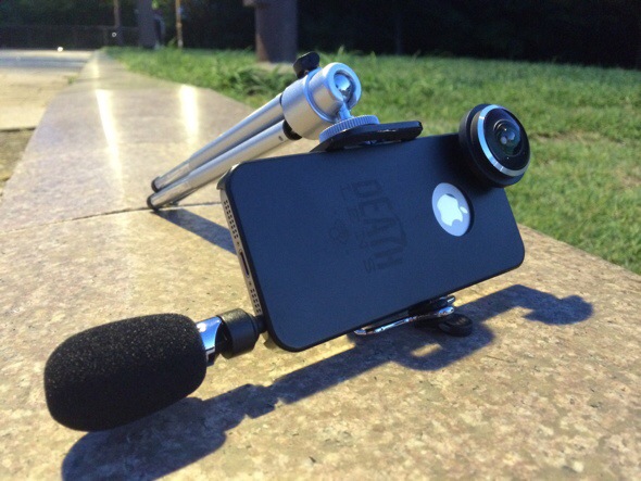 これは三脚にクリップを付け、iPhoneにデスレンズとマイクを装着したもの。