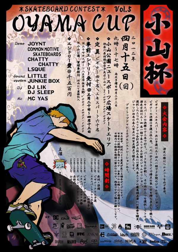 4月15日に橋本小山公園スケートパークで毎年恒例の「OYAMA CUP vol.5」が開催予定になってます!!今回も招待チームは「JOYNT」、「LESQUE」、「CHATTY CHATTY」、「COMMON MOTIVE」などデモに参加予定です!!