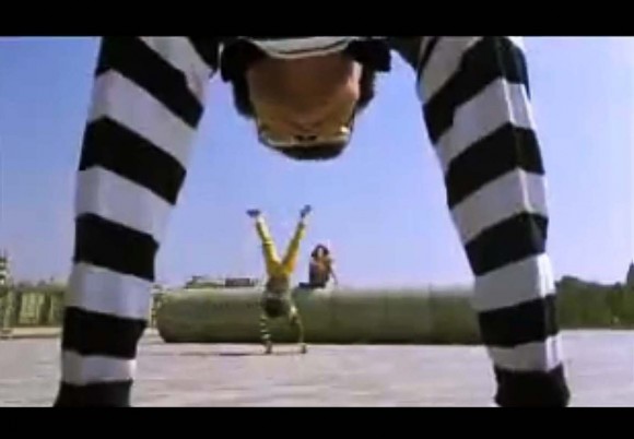 ユン・ピョウさんのハンドスタンドから覗くジャッキーさんのハンドスタンド。奇跡のアングルです。