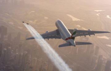 ジェットエンジン付きの翼を背負い空を飛ぶジェットマンとジャンボジェット機のコラボ動画。