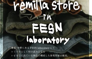 2シーズンに渡りREMILLAのカタログにも出て頂いた森田貴宏氏にお声がけを頂き、東京の中野にあるFESN laboratoryにて、レミーラ初の試みとなる、いままでに出ている商品で構成し、出会いを交えた体現による展示販売をいたします。
