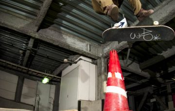 小さい飛び出しバンク(写真の左側の木でできてるセクション)を使って縦コーンをbsフリップで飛び越すことにしたのですが、手作りのしょぼいバンク全体を入れるとパークっぽくなるので、思い切ってバンク自体に寄ってほとんどセクションを写真に入れずに撮影。コーンは地面に置いたらさすがに低すぎるので落ちていたタイヤをかまして高さをアップ。スタイルを写真の中心よりわざと端に持ってきて、バンク側に読者の目がいかないように構図を決めました。