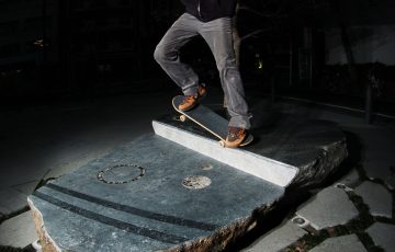 ライダーの村岡洋樹は当時自分がチームマネージャーをしていたBP TRADINGのライダーで、この日はビデオや写真の撮影をしようと洋樹の家でピックアップ。洋樹が知ってる良いスポットが地元にあるとのことでさっそく行ってみるとベンチのようなオブジェがマンションの下に。高さはひざ上ぐらいの上質の縁石ですが、着地が厄介。芝生をお洒落に植えたおかげで前側にポップアウトでピンポイントに着地しないとウィールが芝生に入ってしまいメイクできず。軽くアップしてさっそくトライ。カーブ自体は滑るのですがグラインドの後の着地を意識してしまいなかなかメイクできず。しかし15回ほどでノーズがカーブにつかないマニュアルノーズグラインドで着地も完璧にメイク。この後シークエンスもさっくり撮影。