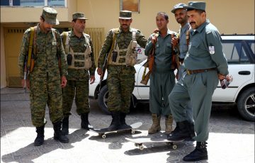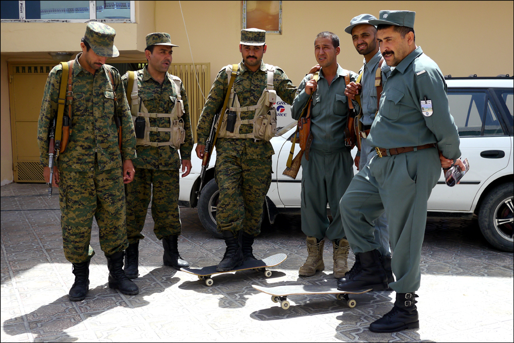 In early June this year, I found myself sitting in the back of a jeep tearing straight down the middle of a two-lane desert road in the Balkh province, Northern Afghanistan, sirens blazing, sandwiched between two burly soldiers holding Kalashnikovs. The other motorists were being forced off the road to let us pass as we pursued our RPG and machine gun armed police escort ahead. As we cruised by UN troops en-route to Mazar-e-Sharif, I wondered what they would think if they could see the skateboard that was tucked between my knees. The two luxury SUVs with tinted windows in close convoy behind us belonged to the Governor Atta Muhammad Noor, and carried my friends from Europe, the States and Russia. I’m a 25 year-old skateboarder from middle England wondering – ‘What am I doing here?’