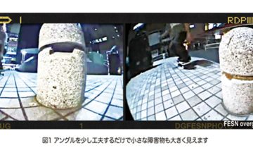 まずは下のふたつの映像をご覧下さい(図1)。下のふたつの映像は同じスポットで撮影しています。見た目は普通の大きさの障害物に見えますが、実際は膝下のとても低い障害物です。このように撮影するカメラのアングルで障害物を大きく見せることができます。撮影の方法としては、まず第一にカメラのフレームを埋めるように障害物を映すということです。もともと大きな障害物であれば、必然的にフレームを埋め尽くすことはできますが、小さな障害物では意識して映さないと、障害物以外の空白が多くなってしまいます。普段よりも距離を詰めて撮影しないと、フィッシュアイを使用している場合、余計に小さく映ってしまいます。また、なるべくギリギリまでカメラを障害物に寄せておく必要があるという点です。その理由としては、1トリック(1カット)約7秒で撮影するとして、実際に使われる映像は4~5秒ぐらいになります。特に小さなスポットではギリギリまでタメを作るとカメラを俊敏に動かさないといけないので、注意が必要です。