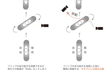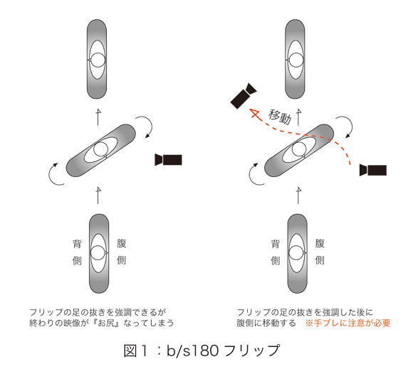 よく撮影で苦労していたのはFsの縁石系のトリックです。どうしても「お尻」の映像が多くなってしまうからです。非常にシンプルなトリック(Fs 50-50など)ほど撮影するテクニックが必要になります。もし壁際の縁石でなかったり、腹側から撮影できればいいですが、難しい場合はライダーと相談してトリックを変えるのもひとつの手段だと思います。例えばアウトを180°系にしてもらうことで、意図的に背側から撮影したということになります。その他には回しの入った180°系のトリックです(特にBs180°フリップ)。さまざまなスケートビデオを見ていると180°系のトリックは180°した後が腹側になる(始めはお尻側で回ったあとはお腹側)ように撮影される映像が多いと思います。しかしこれにフリップやヒールフリップが入ると足の抜きが特徴的なライダーの良さを殺してしまうのではないか? という疑問がわいてきます。もしこの抜きが特徴的でなければ問題ないのですが、スパッと豪快に抜いてくるライダーの場合どうしても足を抜く側から撮影したくなります。実際に足を抜く側から何度か撮影しましたが、足を抜く映像は迫力ありますが、終わりの映像がどうしても「お尻」になってしまい、あまりしっくりくる映像にはなりませんでした。この問題の攻略方法はふたつあり、ひとつ目はセオリー通りのポジションで撮影して180°した瞬間にカメラの位置を180°する方向と逆に回すことによって、ライダーの抜き足を撮影するという方法です。そうすることによって、抜き足と終わりの映像がお尻でなくなり、スマートな映像を撮影することができました。もうひとつは足を抜く側から撮影し、ライダーが足を抜いた瞬間に腹側に移動するという方法です。しかしこれらの対処方法はカメラを大きく動かさなくてはならないため、慎重に行わないとカメラのブレが目立ってしまいます(※図1を参照)。