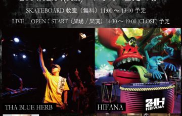 時間:SKATEBOARD教室(無料) 11:00~13:00予定 / LIVE START 14:30~19:00予定