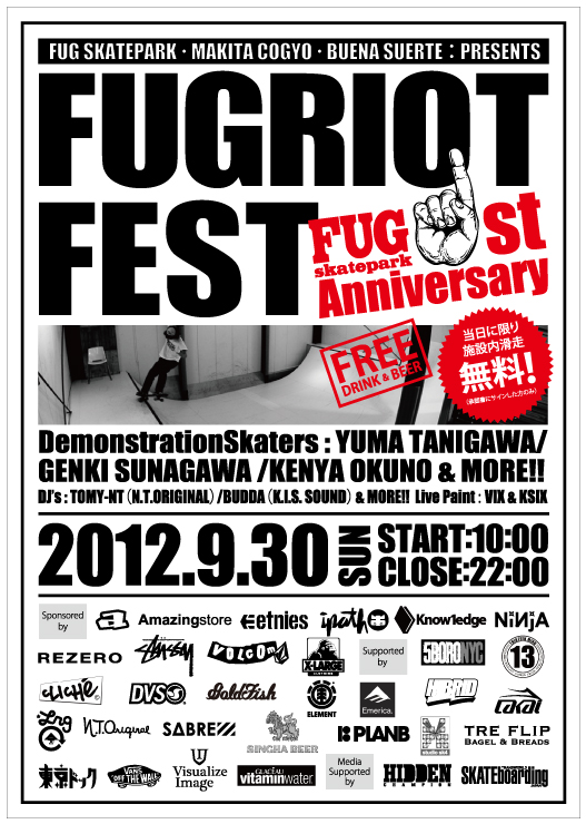 来る9月30日(日)に、埼玉県志木市のインドアパーク、FUG Skateparkの一周年を記念して