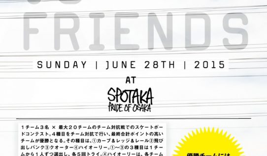 今週日曜日(6月28日)に大阪・Spotakaスケートボードパークで行われるetniesプレゼンツのコンテスト“TEAM VS FRIENDS”のエントリーリストが発表。 メンバー…