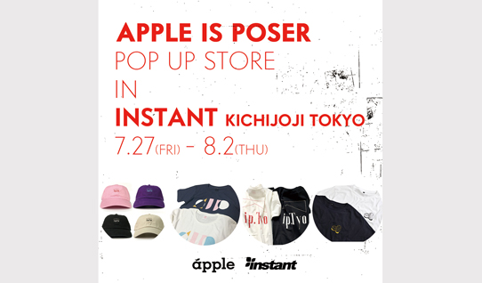 appleクルーによるアパレルライン、Apple Is Poserのポップアップストアが7月27日(金)~8月2日(木)にかけてインスタント吉祥寺にて展開。 新鋭スケーターたちによ…