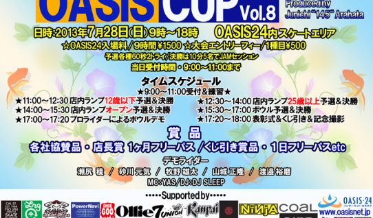 荒畑“145”潤一プロデュースによるスケートコンテスト、 Oasis Cup Vol. 08が7月28日(日)に瑞穂のOasis24内スケートエリアで開催される。 豪華なスケーター…