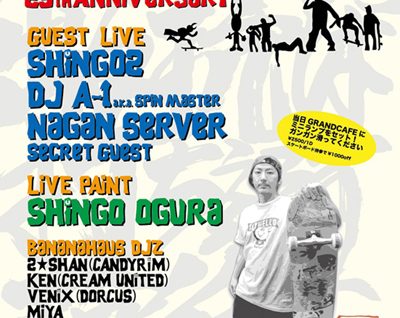 7月27日(土)に大阪はアメリカ村にあるGRANDCafeにて、 長年大阪のストリートスケートを牽引してきたVenixこと野上竜也の スケート歴25周年を祝うイベント、BANANA…