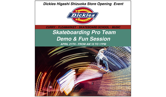 Dickies東静岡が4月21日(土)にオープン。 オープンを記念し伊藤慎一、星野大喜、吉岡賢人、竹井勇磨らによるミニランプでのデモ&ファンセッション、そしてCheesによるスケー…
