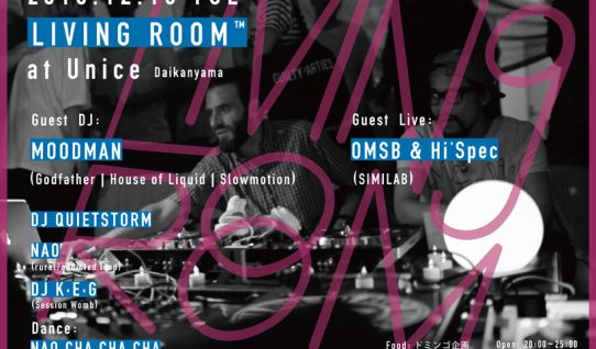 DJがフロア中央のソファに座り、音楽を楽しむ観客に囲まれてプレイを行うというDJ Quietstormらによる画期的なイベントLIVING ROOM™が12月13日(火)にUnic…
