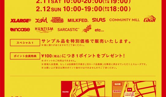 LakaiやXLARGE®、incaseなどを取り扱うB’s Internationalのファミリーセールが2月11日(土)、12(日)の2日間で開催。 メンズやレディスなどのアイ…