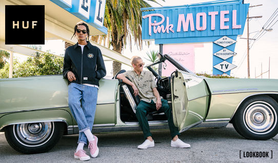 HUFの最新コレクションのルックブック。スケーターに馴染み深いピンクモーテル、ネオン管やスーヴェニアショップなどからインスパイア。