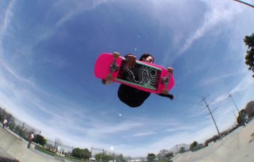 ネオンピンクのデッキを用いてスケートパークでセッション。