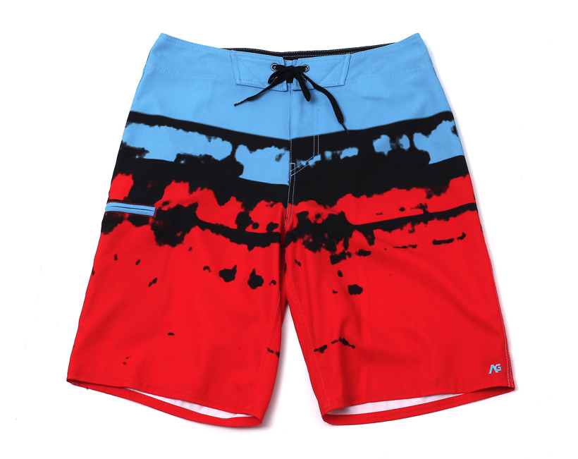ブルーとレッドとブラックの3色が織り交じった抽象的なデザインが興味を誘うボーダーショーツ。