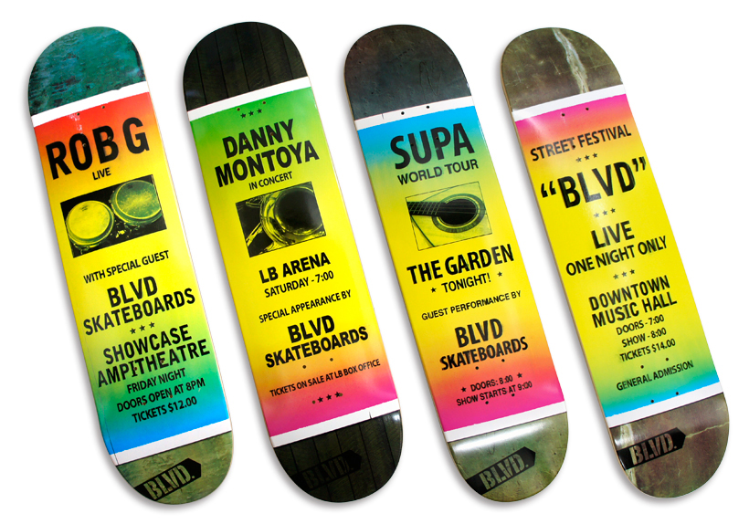 ライブのイメージが伝わるデザインと鮮やかな発色のグラデーションが美しいConcert Series。左から、ロブ・ゴンザレスモデル(7.75インチ / 8.0インチ)、ダニー・モントヤモデル(7.625インチ / 8.0インチ)、ダニー・スパモデル(7.75インチ / 8.0インチ)、チームモデル(7.5インチ / 7.875インチ)。すべて¥9,450