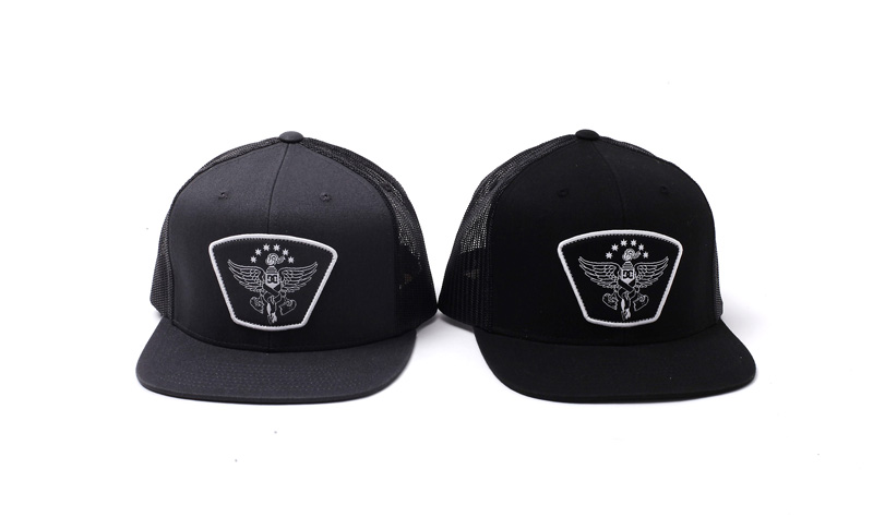 オールブラックのボディに硬派で無骨なDCロゴワッペンが大胆に配置されたメッシュキャップ。