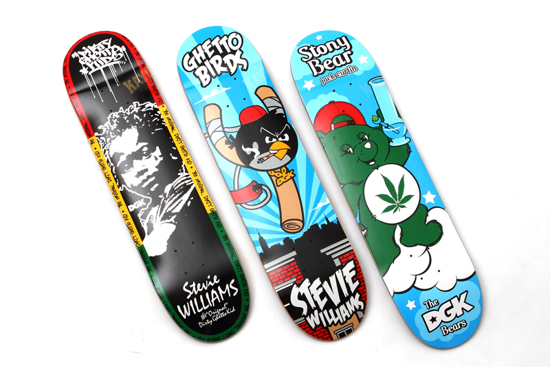 写真左から、スティービー・ウィリアムスのThe Originalsモデル(7.5×30.8)、スティービー・ウィリアムスのGhetto Birdsモデル(7.63×31.06)、