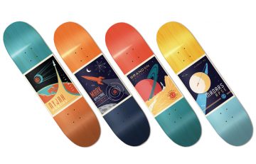 通常の10〜15%の軽量化を実現したHeliumデッキを採用。写真左から、Nyjah Cosmonaut(8×31.75)、Appleyard Cosmonaut(8.125×31.625)、Westgate Cosmonaut(8×31.75)、Madars Cosmonaut(7.75×31.25)。すべて¥12,420