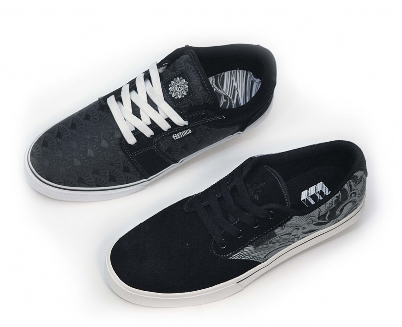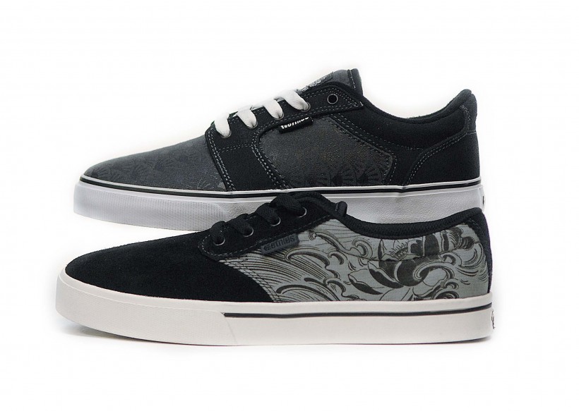 写真上から、アッパーのほぼ全面にウロコのグラフィックが配置されたBarge LSモデル¥9,450、