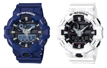 独自の樹脂成形技術による立体的な時分針と力強いインデックスを採用したGA-700。写真左から、GA-700-2AJF、GA-700-7AJF。各色ともに¥15,660