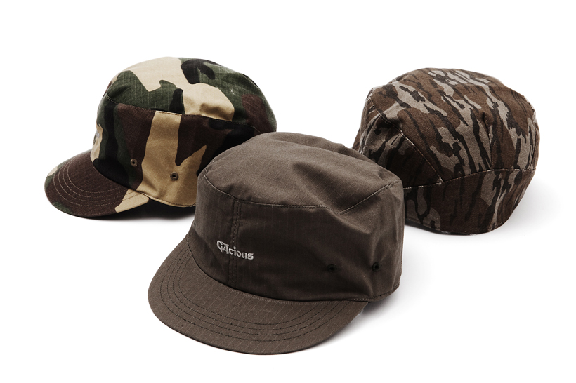 後部にかけて立体的な裁断をおこなったアーミーキャップ。左からコットンリップのウッドランドカモ柄、コットンリップのオリーブグリーン、ダックスコットン素材のツリーカモ柄。すべて¥5,460