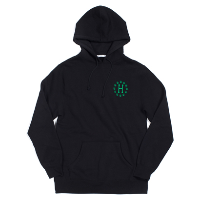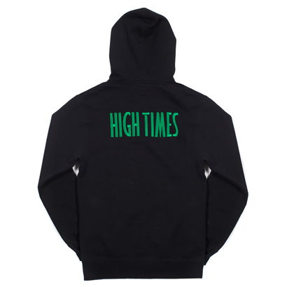 フロントの胸にはマリファナ柄とHUFのロゴ、バックにはHIGH TIMESの文字が刺しゅうされたフーディ。¥11,550