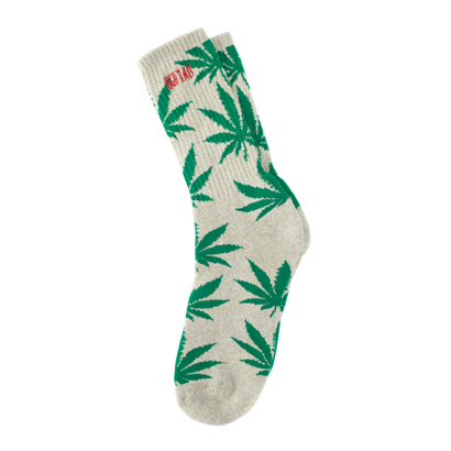 マリファナの総柄を採用したハイソックス。ナチュラルカラーの上に赤い糸で施された