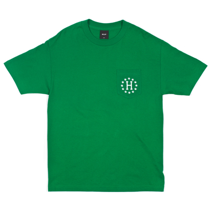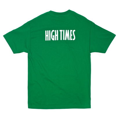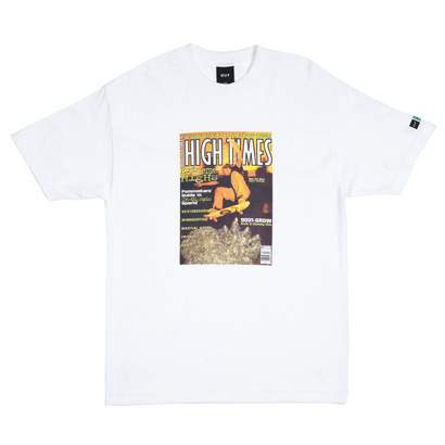 フーディと同様、フロントにマリファナに囲まれたHUFのロゴ、バックにHIGH TIMESのロゴがプリントされたポケットTee。