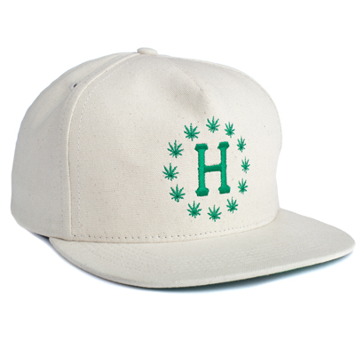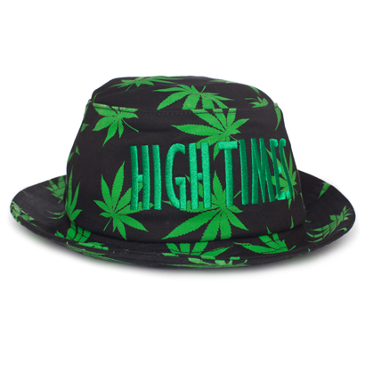 写真左から、マリファナの総柄にHIGH TIMESの刺しゅうを施したハット ¥5,250、サイドにHIGH TIMESの刺しゅう、