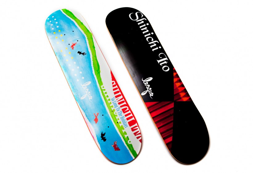 伊藤慎一シグネチャーデッキ。左からHolidayモデル(7.625×30.75)、Pencilモデル(7.75×31.75)。ともに¥9,975